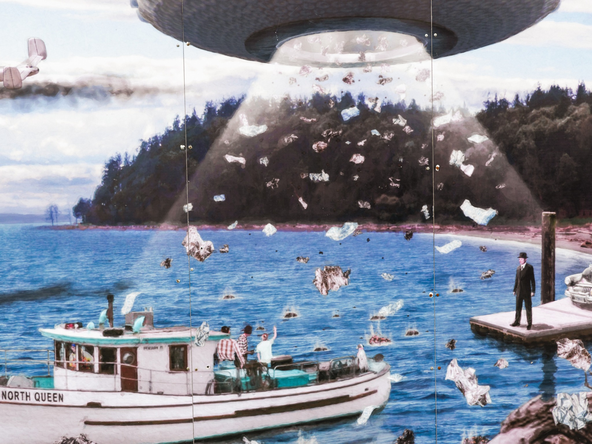 Dahl said that one of the objects "began spewing forth what seemed like thousands of newspapers from somewhere on the inside of its center. These newspapers, which turned out to be a white type of very light weight metal, fluttered to earth". According to Dahl, a substance resembling lava rocks fell onto their boat, breaking a worker's arm and killing a dog.